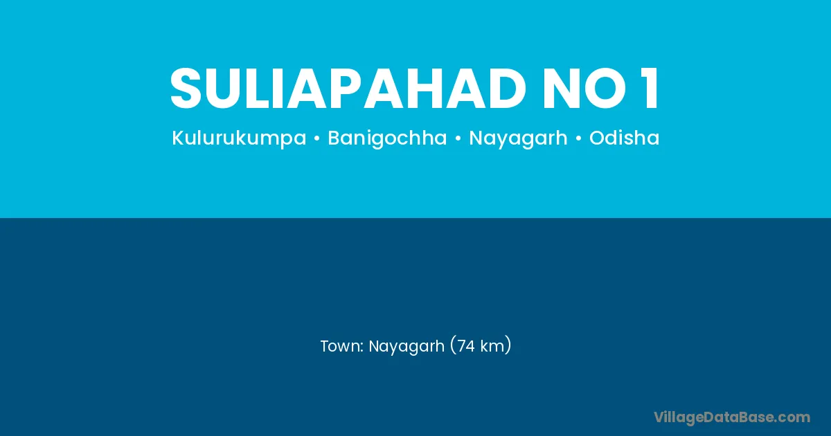 Nayagarh (74 km) is the nearest town to Suliapahad No 1 village for major economic activities and is located approximately 74 km away.