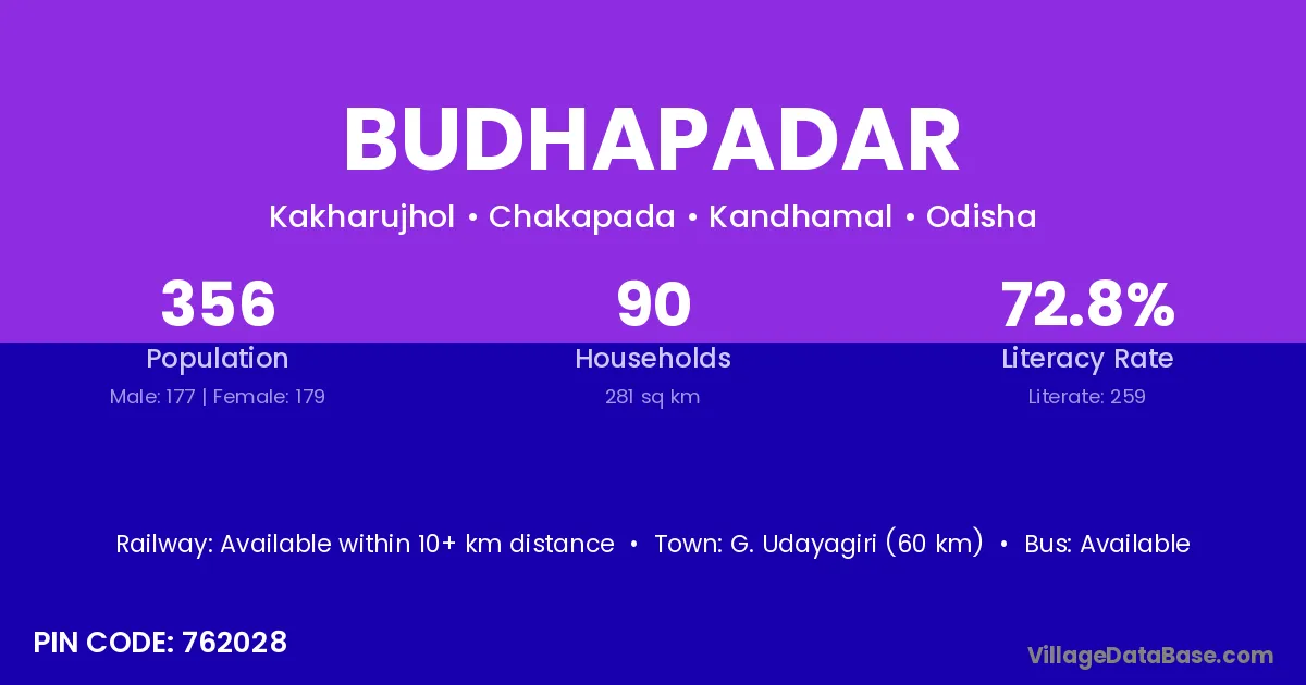 Nayagarh (50 km) is the nearest town to Budhapadar village for major economic activities and is located approximately 50 km away.