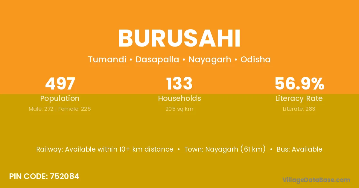 Nayagarh (61 km) is the nearest town to Burusahi village for major economic activities and is located approximately 61 km away.