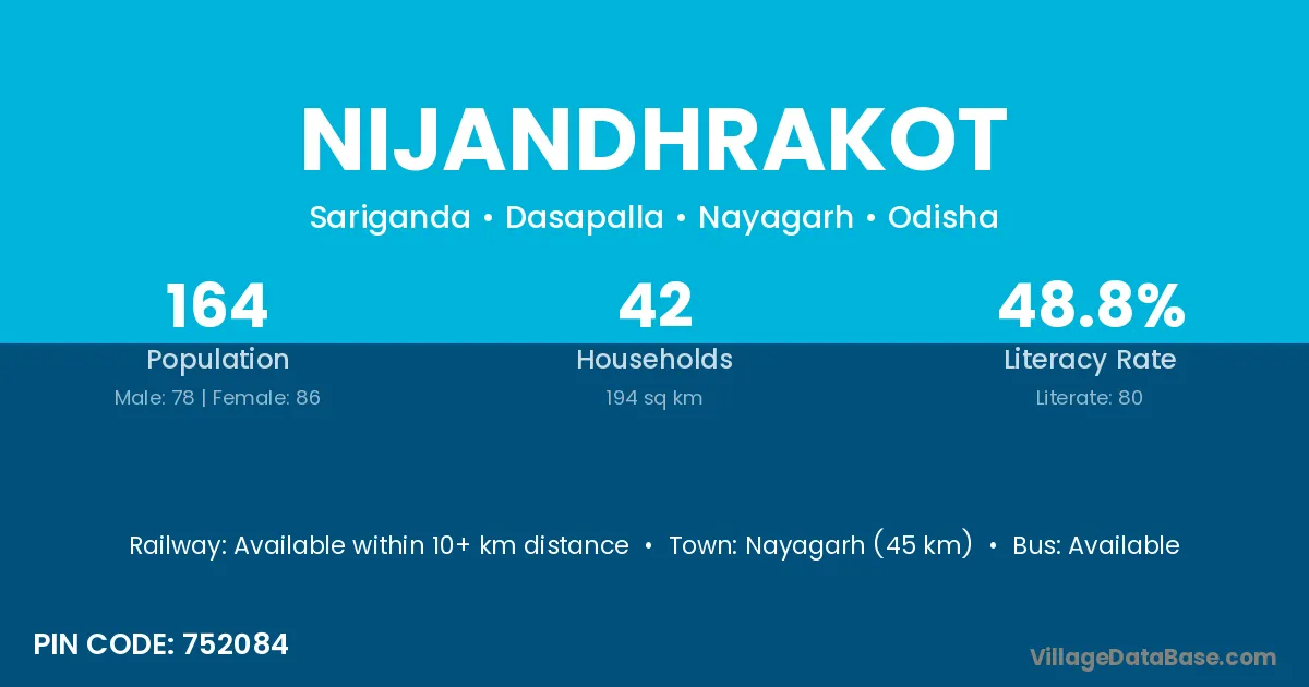 Nayagarh (45 km) is the nearest town to Nijandhrakot village for major economic activities and is located approximately 45 km away.
