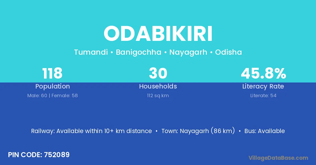 Nayagarh (54 km) is the nearest town to Odabikiri village for major economic activities and is located approximately 54 km away.