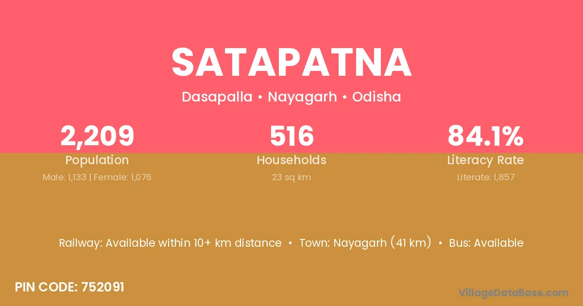 Nayagarh (41 km) is the nearest town to Satapatna village for major economic activities and is located approximately 41 km away.