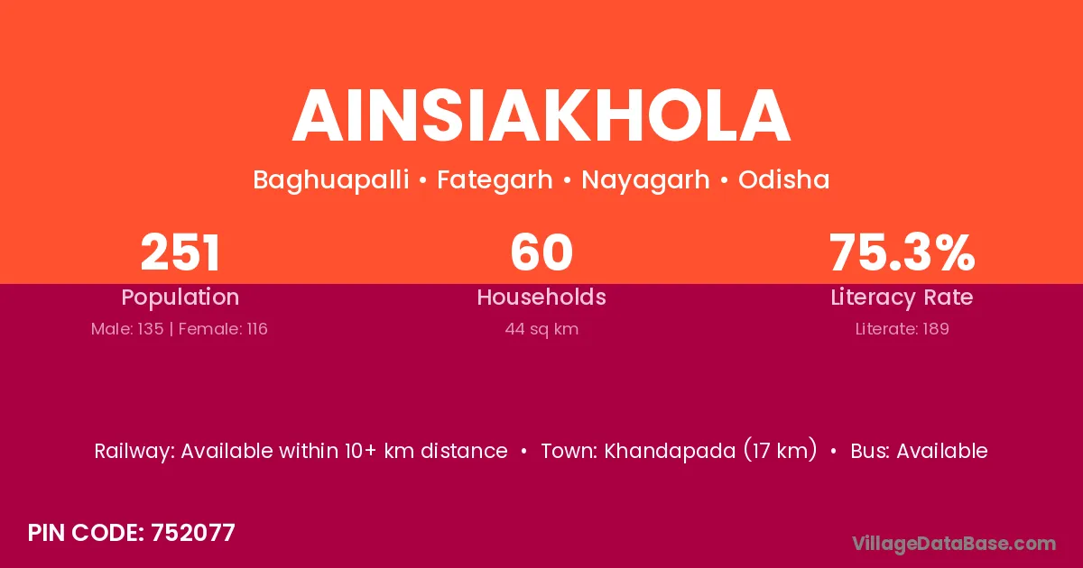 Khandapada (17 km) is the nearest town to Ainsiakhola village for major economic activities and is located approximately 17 km away.