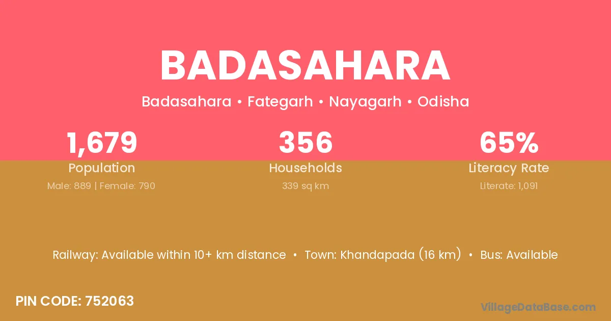 Khandapada (16 km) is the nearest town to Badasahara village for major economic activities and is located approximately 16 km away.