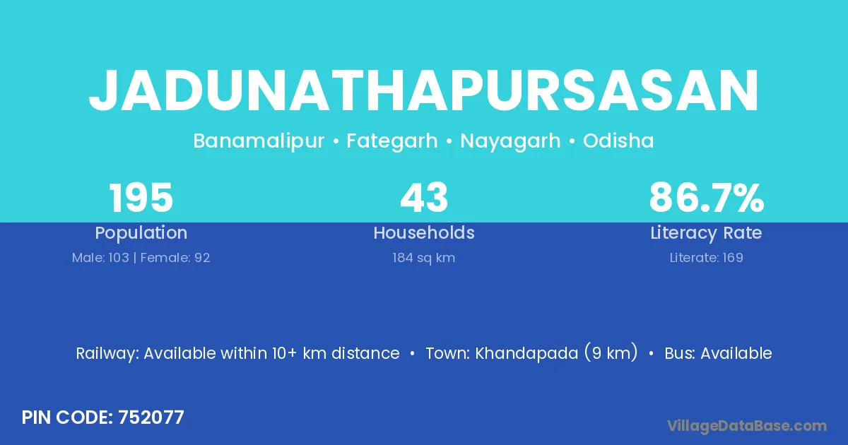 Khandapada (9 km) is the nearest town to Jadunathapursasan village for major economic activities and is located approximately 9 km away.