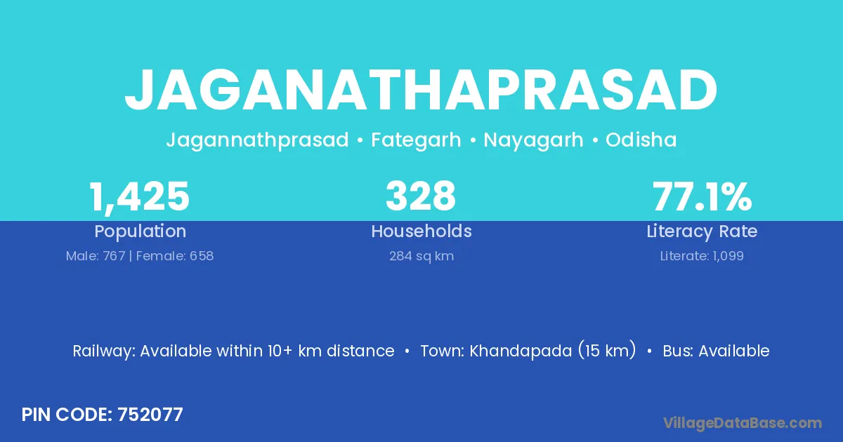 Khandapada (15 km) is the nearest town to Jaganathaprasad village for major economic activities and is located approximately 15 km away.