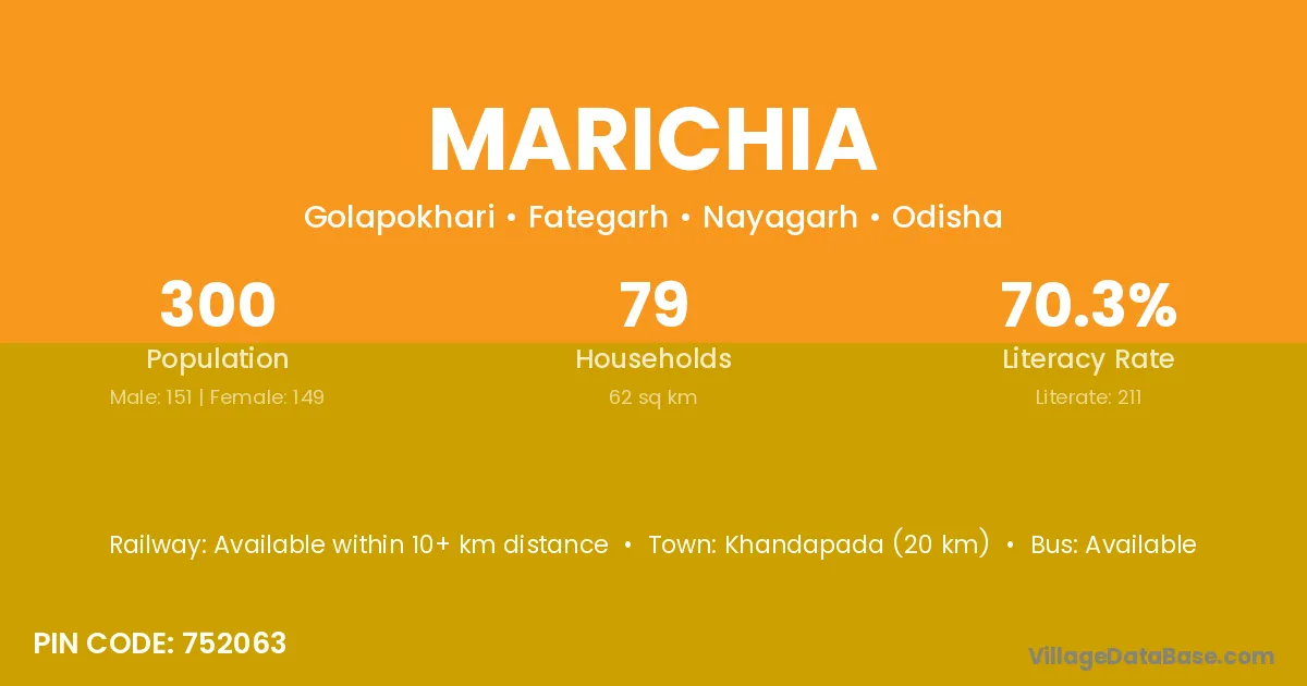 Khandapada (20 km) is the nearest town to Marichia village for major economic activities and is located approximately 20 km away.