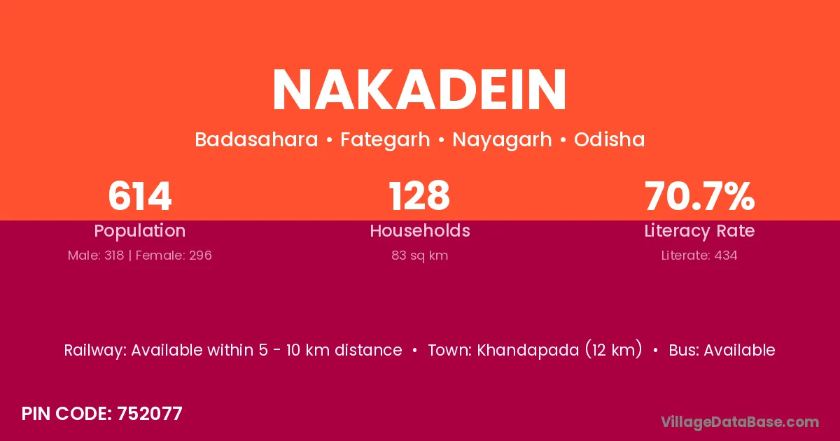 Khandapada (12 km) is the nearest town to Nakadein village for major economic activities and is located approximately 12 km away.