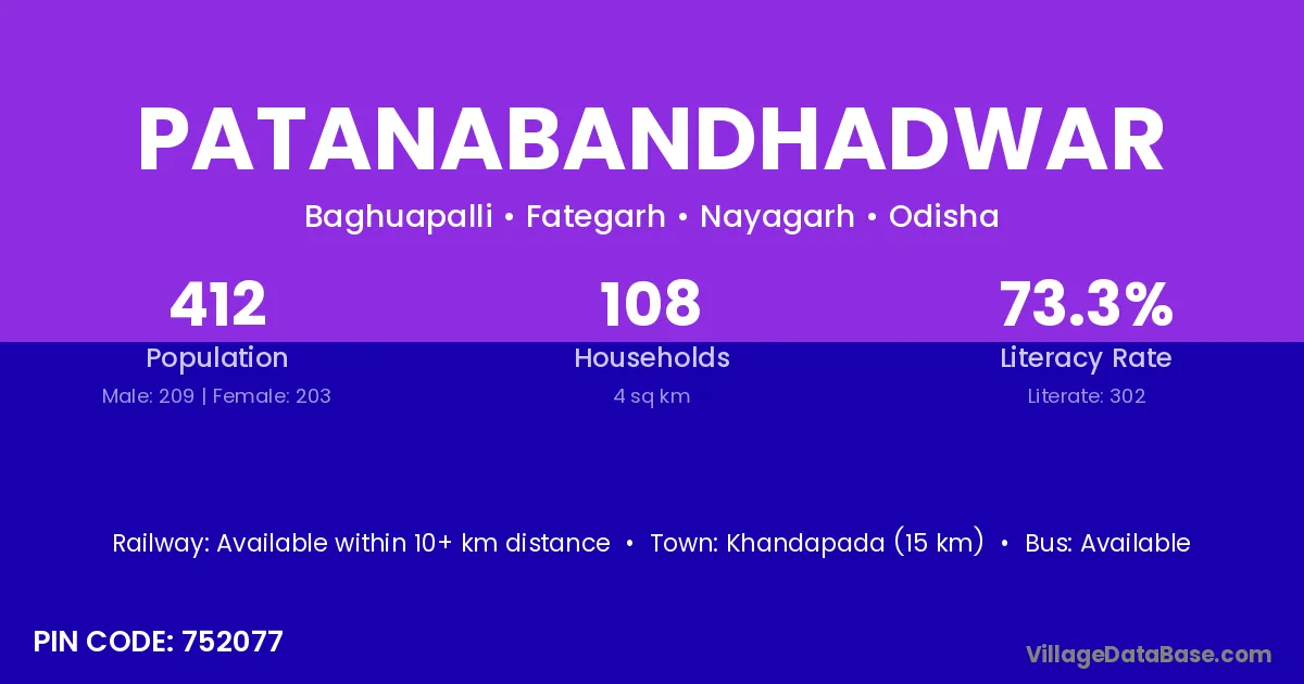 Patanabandhadwar village has a total population of 412 people, of which 209 are males and 203 are females.