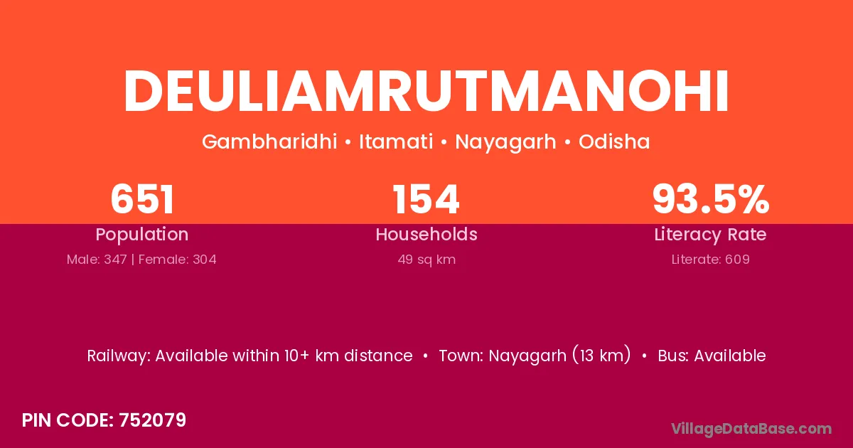 Nayagarh (13 km) is the nearest town to Deuliamrutmanohi village for major economic activities and is located approximately 13 km away.