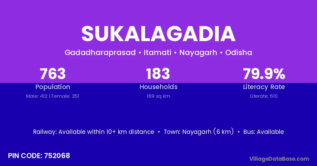 Nayagarh (6 km) is the nearest town to Sukalagadia village for major economic activities and is located approximately 6 km away.