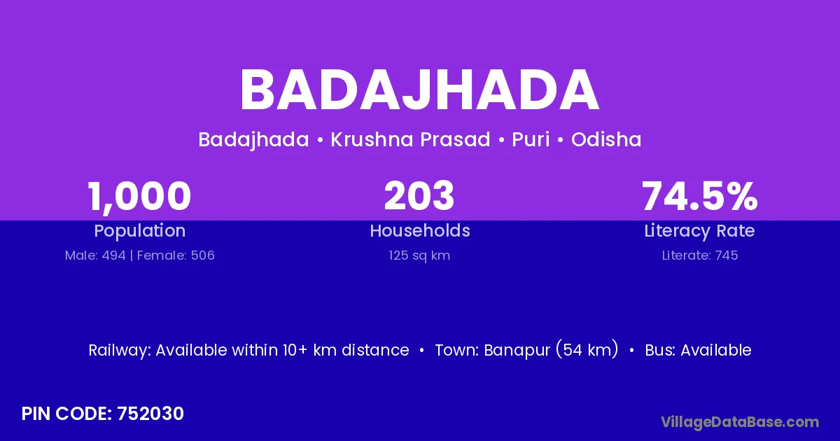 Nayagarh (38 km) is the nearest town to Badajhada village for major economic activities and is located approximately 38 km away.