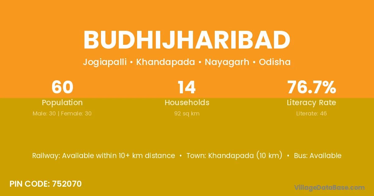 Khandapada (10 km) is the nearest town to Budhijharibad village for major economic activities and is located approximately 10 km away.