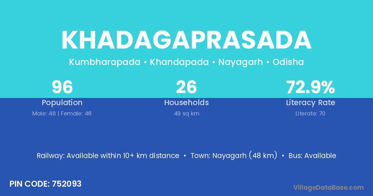 Nayagarh (48 km) is the nearest town to Khadagaprasada village for major economic activities and is located approximately 48 km away.