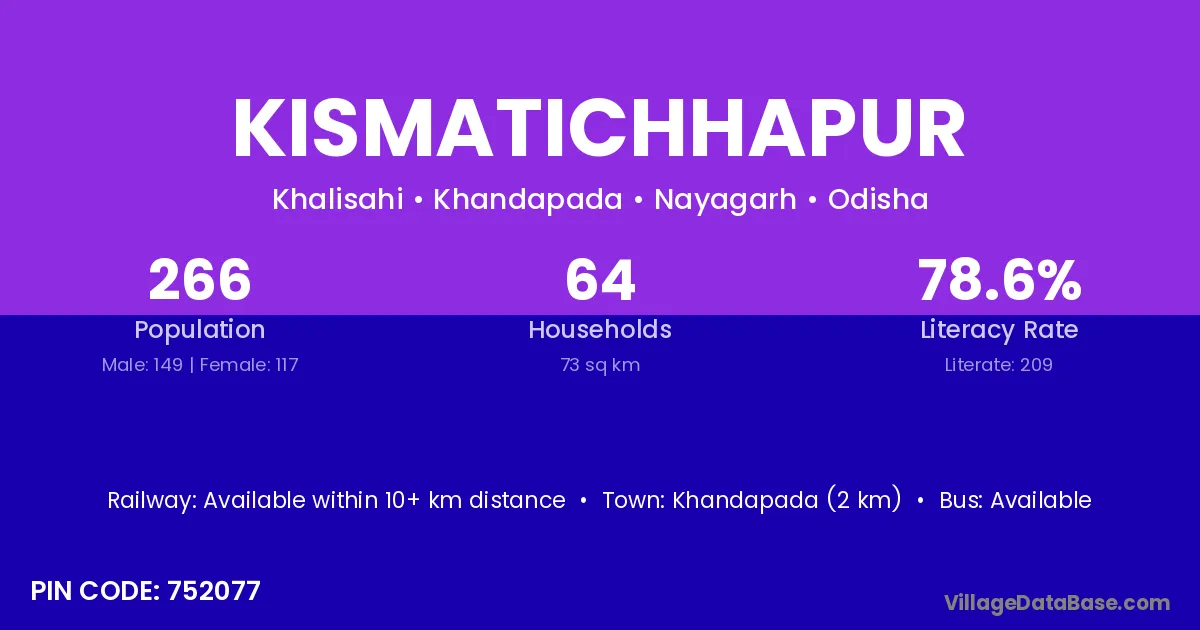 Khandapada (2 km) is the nearest town to Kismatichhapur village for major economic activities and is located approximately 2 km away.