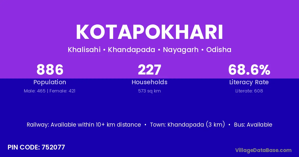 Khandapada (3 km) is the nearest town to Kotapokhari village for major economic activities and is located approximately 3 km away.