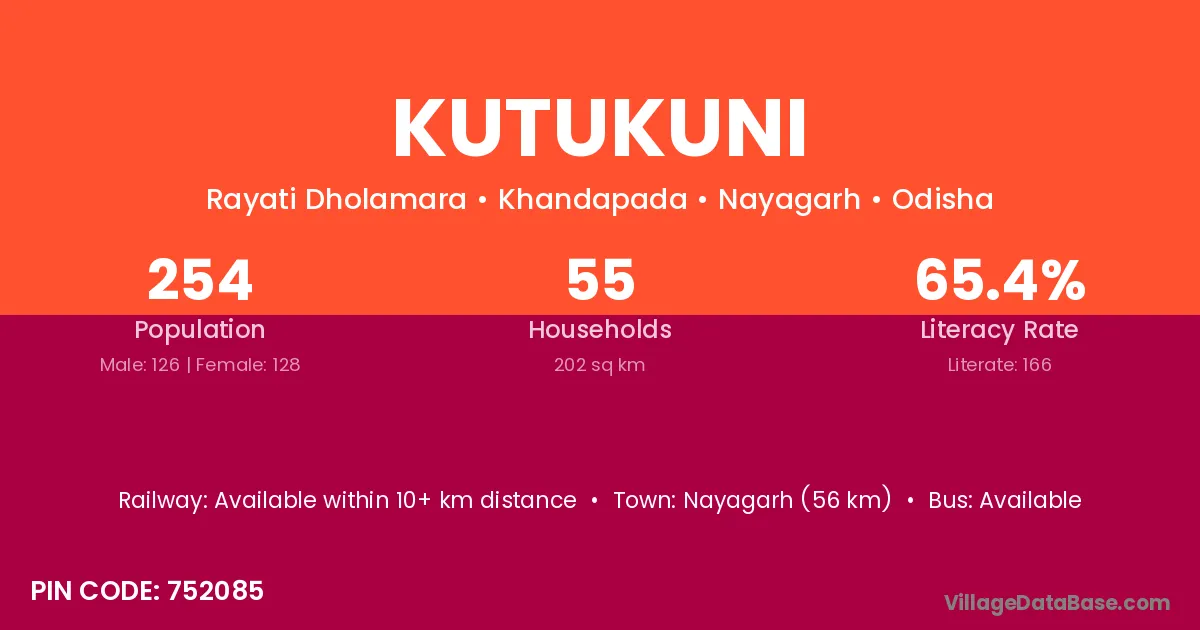 Nayagarh (56 km) is the nearest town to Kutukuni village for major economic activities and is located approximately 56 km away.