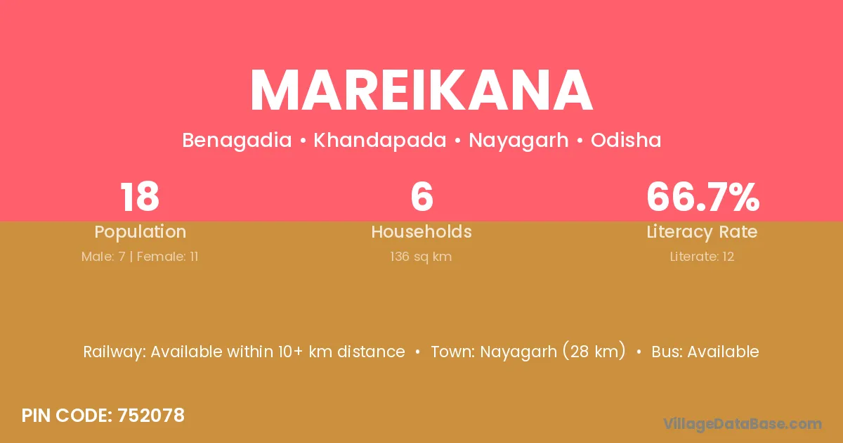 Nayagarh (28 km) is the nearest town to Mareikana village for major economic activities and is located approximately 28 km away.