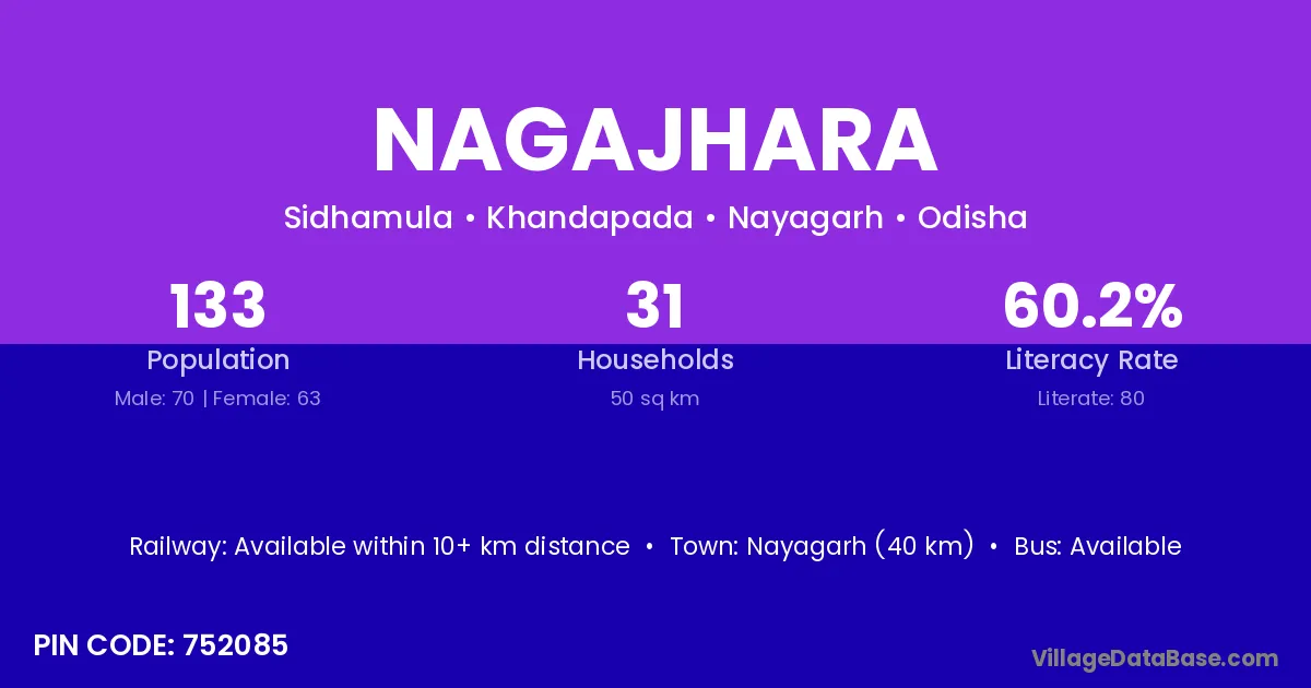 Nayagarh (40 km) is the nearest town to Nagajhara village for major economic activities and is located approximately 40 km away.