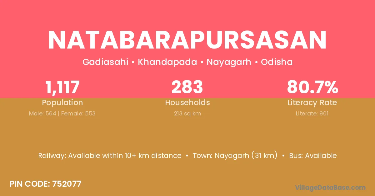 Nayagarh (31 km) is the nearest town to Natabarapursasan village for major economic activities and is located approximately 31 km away.