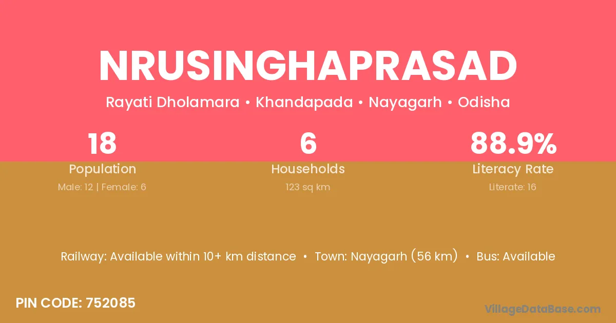 Nayagarh (56 km) is the nearest town to Nrusinghaprasad village for major economic activities and is located approximately 56 km away.