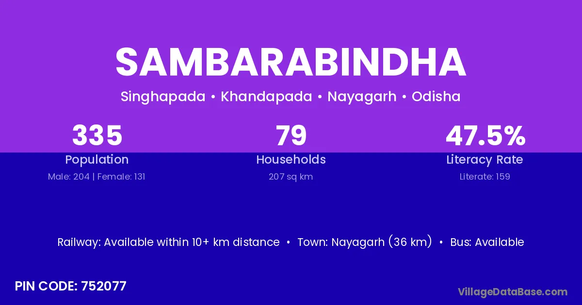 Nayagarh (36 km) is the nearest town to Sambarabindha village for major economic activities and is located approximately 36 km away.