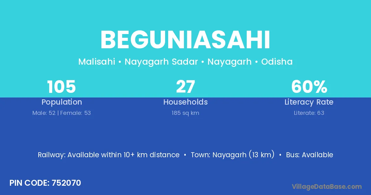 Nayagarh (13 km) is the nearest town to Beguniasahi village for major economic activities and is located approximately 13 km away.