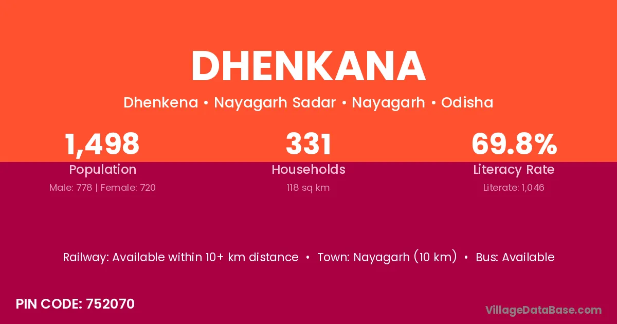 Dhenkana village has a total population of 1,498 people, of which 778 are males and 720 are females.