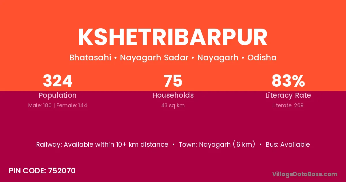 Nayagarh (6 km) is the nearest town to Kshetribarpur village for major economic activities and is located approximately 6 km away.