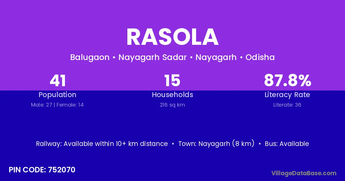 Nayagarh (8 km) is the nearest town to Rasola village for major economic activities and is located approximately 8 km away.