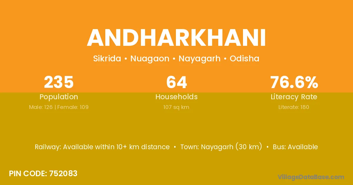Nayagarh (30 km) is the nearest town to Andharkhani village for major economic activities and is located approximately 30 km away.