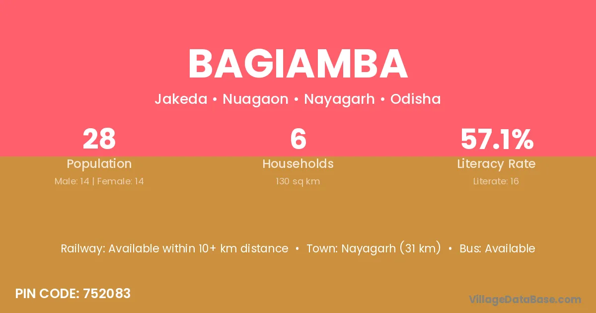 Nayagarh (31 km) is the nearest town to Bagiamba village for major economic activities and is located approximately 31 km away.