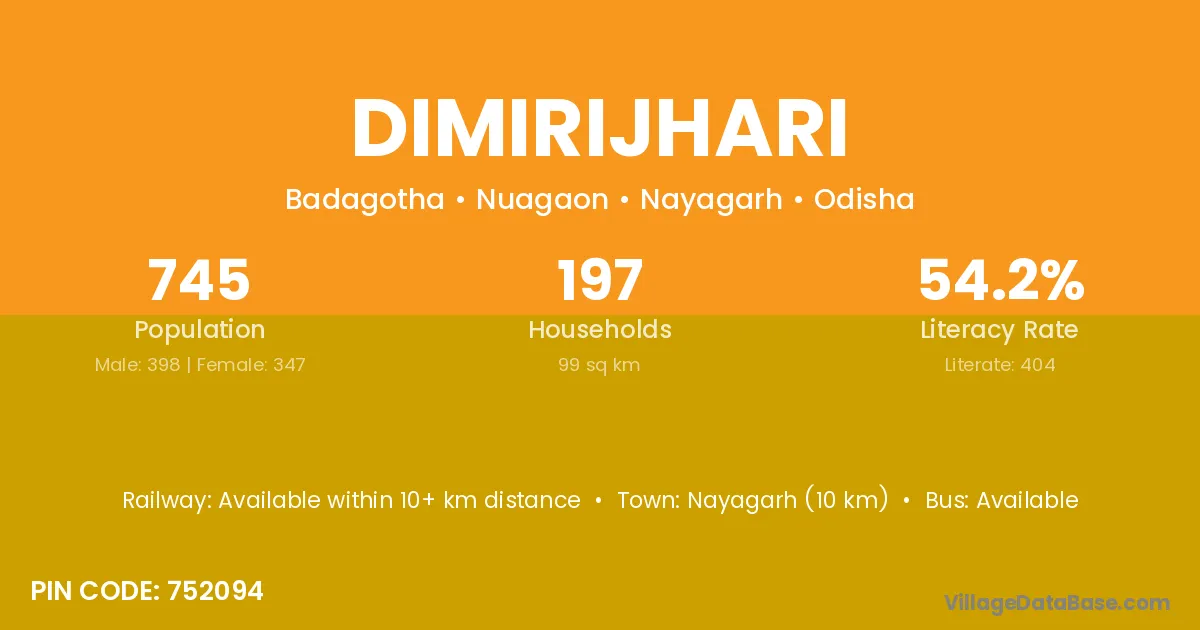 Nayagarh (10 km) is the nearest town to Dimirijhari village for major economic activities and is located approximately 10 km away.