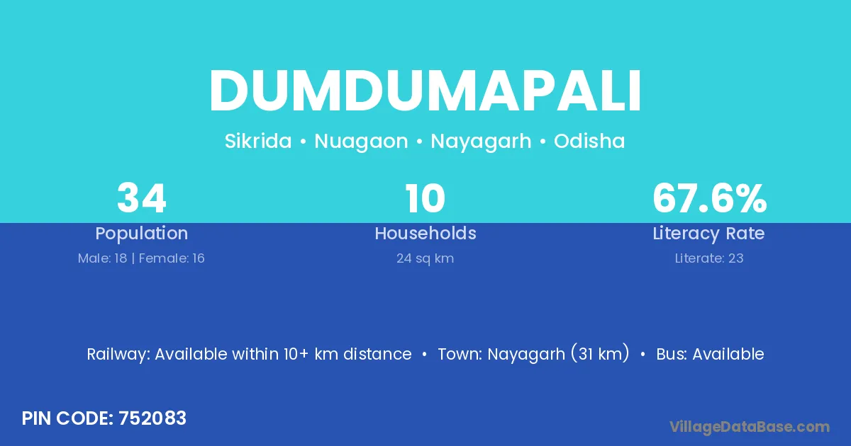Nayagarh (31 km) is the nearest town to Dumdumapali village for major economic activities and is located approximately 31 km away.