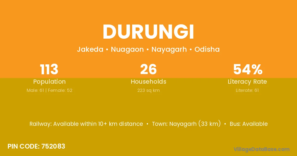 Nayagarh (33 km) is the nearest town to Durungi village for major economic activities and is located approximately 33 km away.