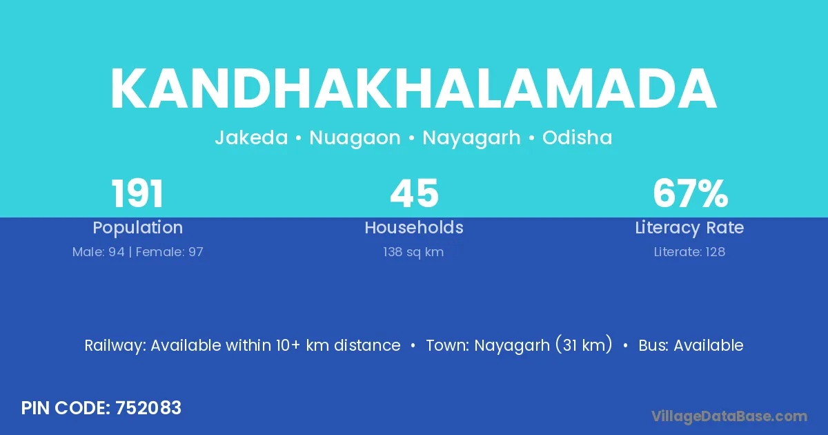 Nayagarh (31 km) is the nearest town to Kandhakhalamada village for major economic activities and is located approximately 31 km away.