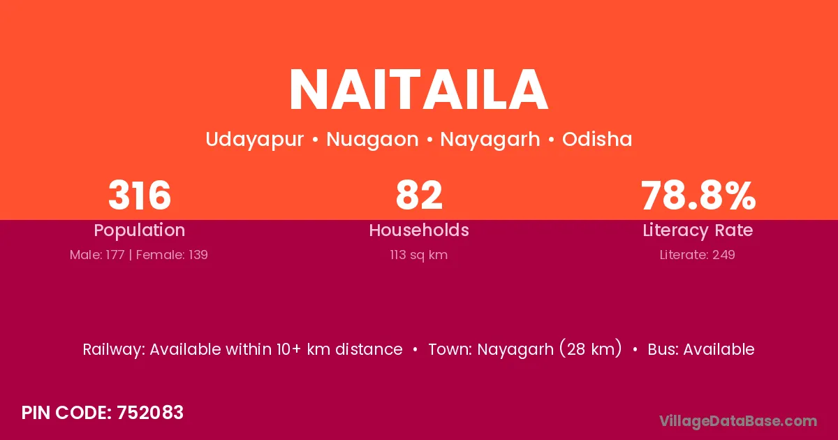 Nayagarh (28 km) is the nearest town to Naitaila village for major economic activities and is located approximately 28 km away.