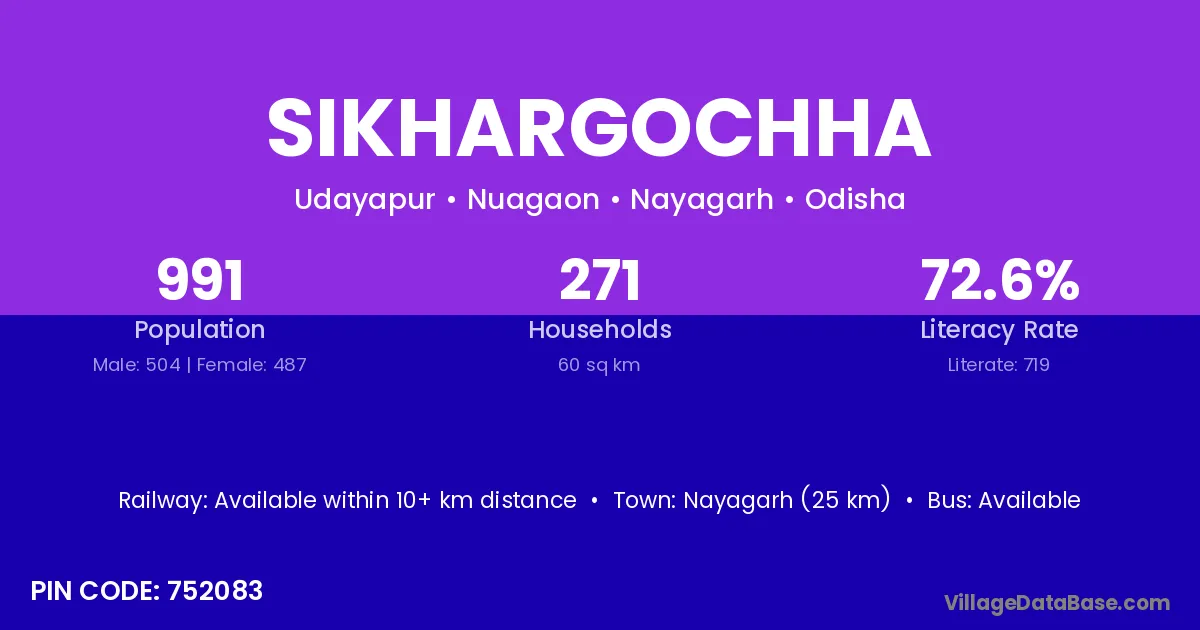 Nayagarh (25 km) is the nearest town to Sikhargochha village for major economic activities and is located approximately 25 km away.