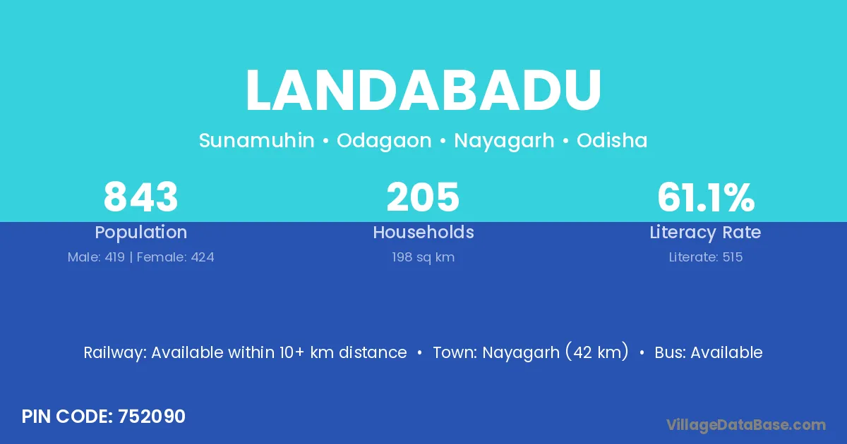 Nayagarh (42 km) is the nearest town to Landabadu village for major economic activities and is located approximately 42 km away.