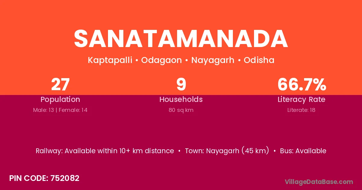 Nayagarh (45 km) is the nearest town to Sanatamanada village for major economic activities and is located approximately 45 km away.