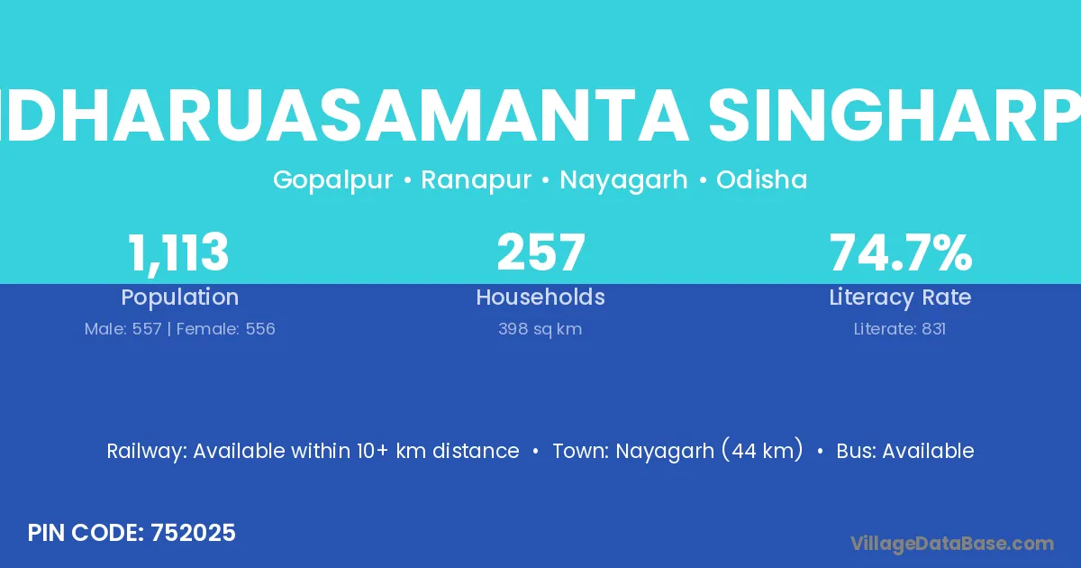 Andharuasamanta Singharpur village has a total population of 1,113 people, of which 557 are males and 556 are females.