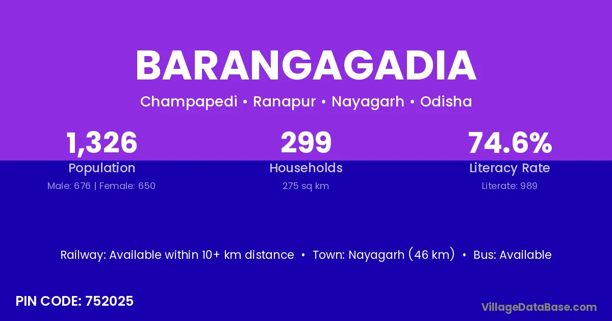 Nayagarh (46 km) is the nearest town to Barangagadia village for major economic activities and is located approximately 46 km away.
