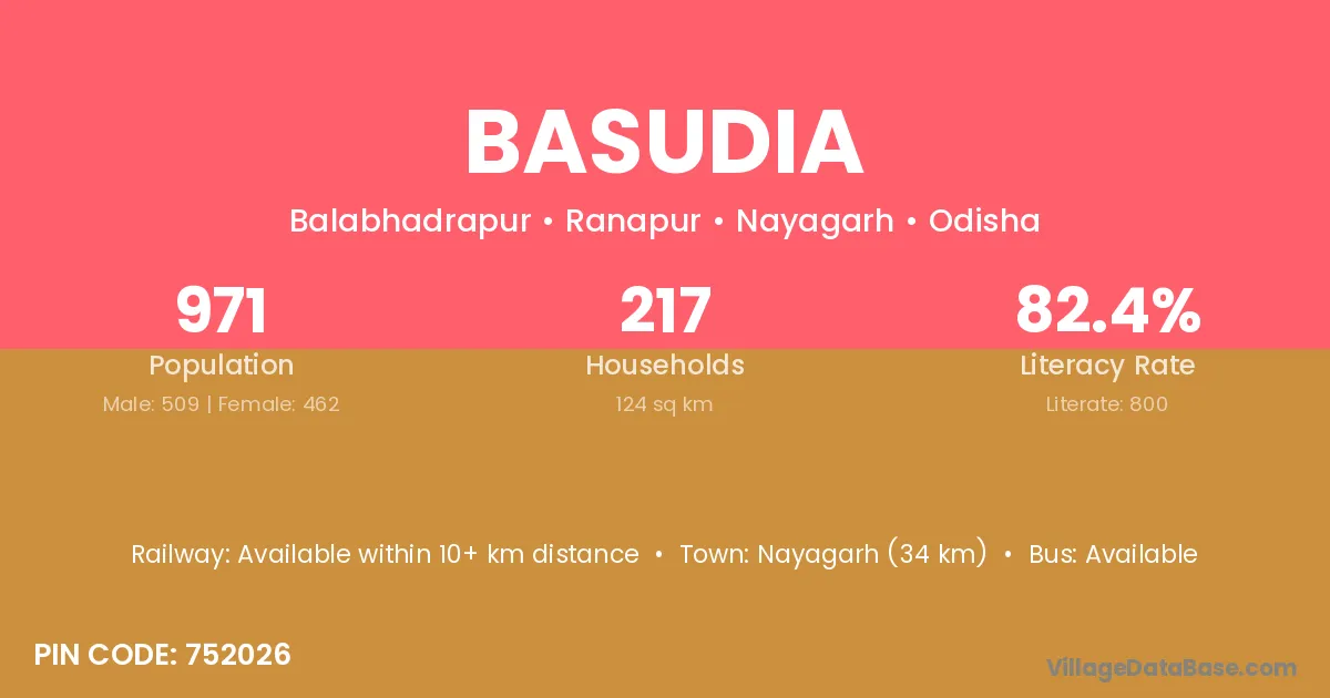 Nayagarh (34 km) is the nearest town to Basudia village for major economic activities and is located approximately 34 km away.