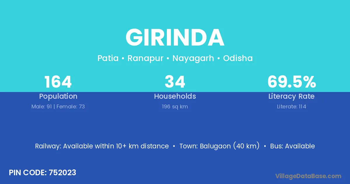 Balugaon (40 km) is the nearest town to Girinda village for major economic activities and is located approximately 40 km away.