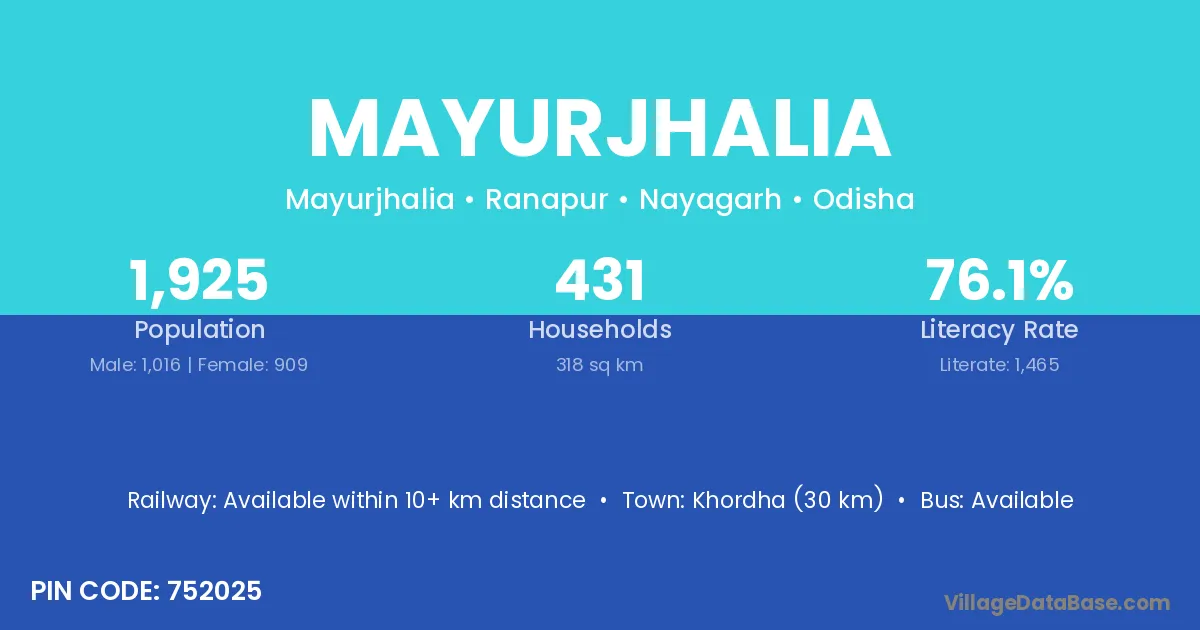 Khordha (30 km) is the nearest town to Mayurjhalia village for major economic activities and is located approximately 30 km away.