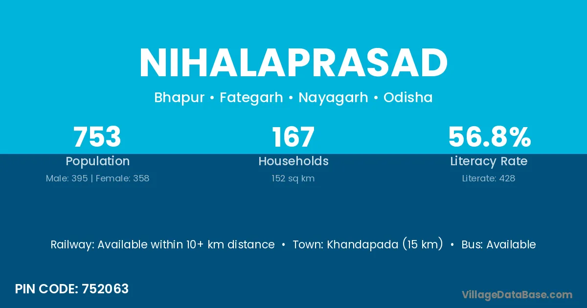 Nayagarh (42 km) is the nearest town to Nihalaprasad village for major economic activities and is located approximately 42 km away.