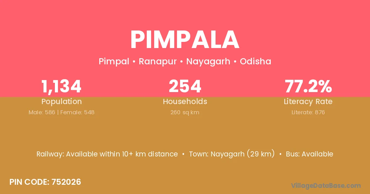 Nayagarh (29 km) is the nearest town to Pimpala village for major economic activities and is located approximately 29 km away.