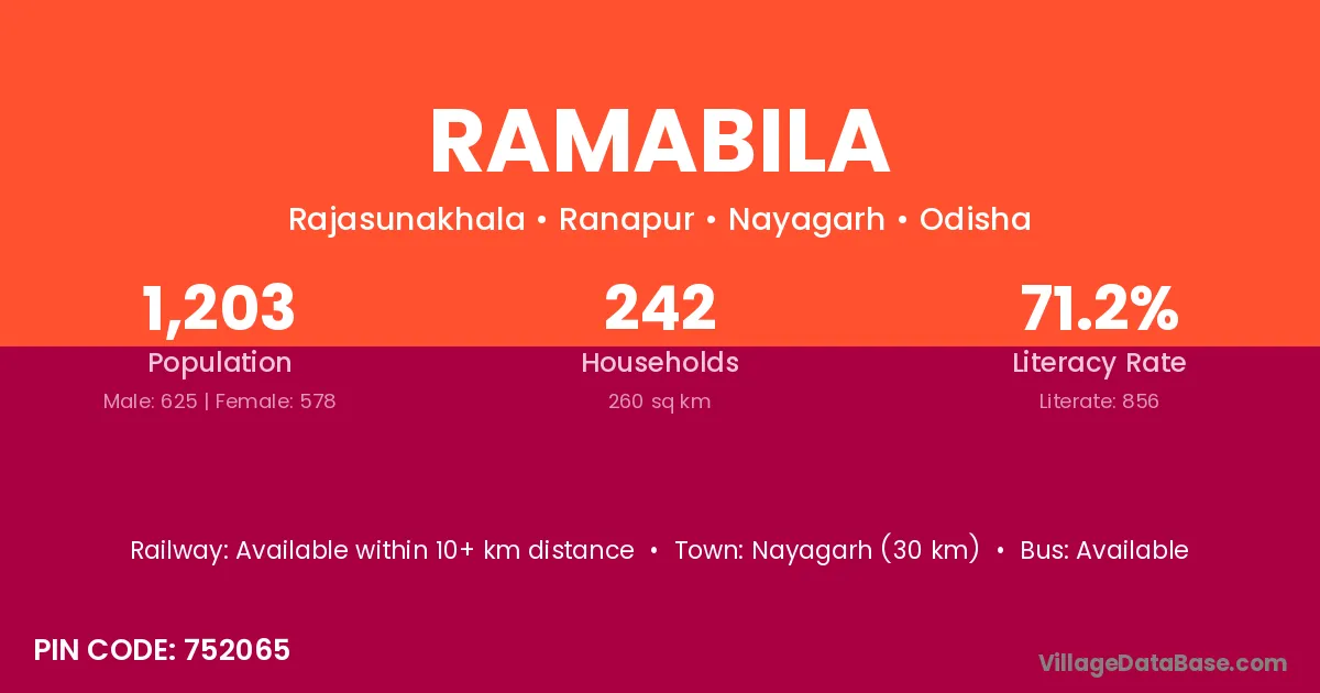 Nayagarh (30 km) is the nearest town to Ramabila village for major economic activities and is located approximately 30 km away.