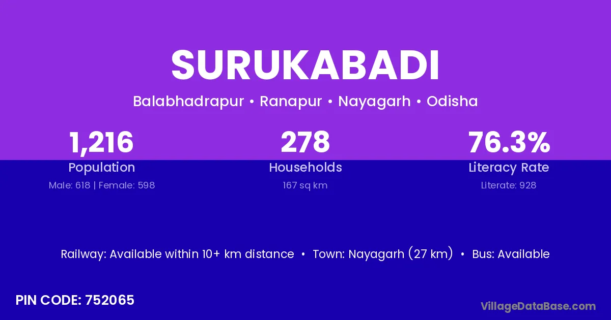 Nayagarh (27 km) is the nearest town to Surukabadi village for major economic activities and is located approximately 27 km away.