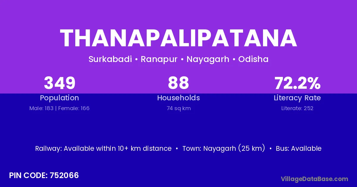 Nayagarh (25 km) is the nearest town to Thanapalipatana village for major economic activities and is located approximately 25 km away.